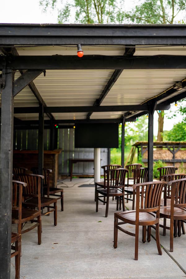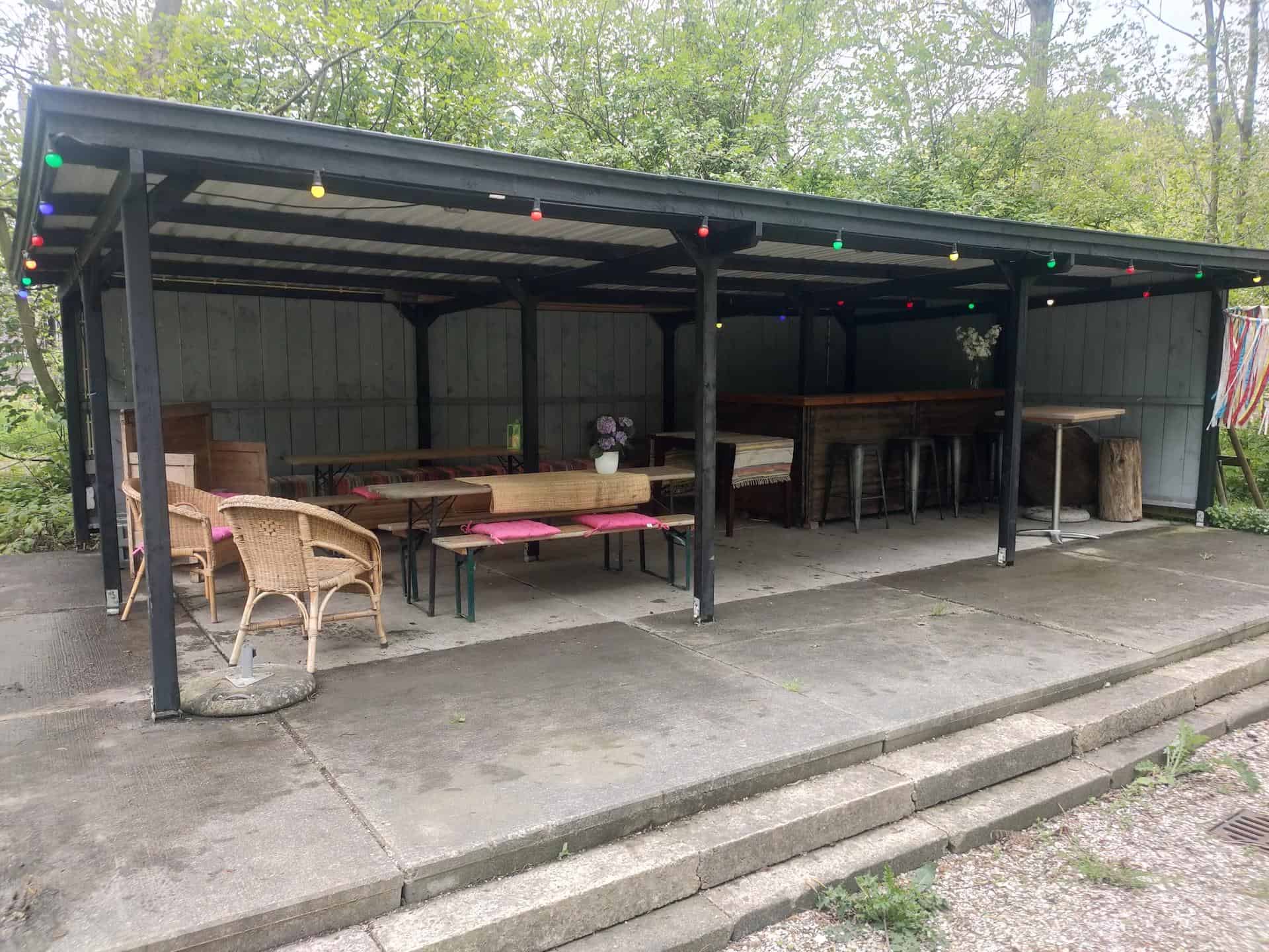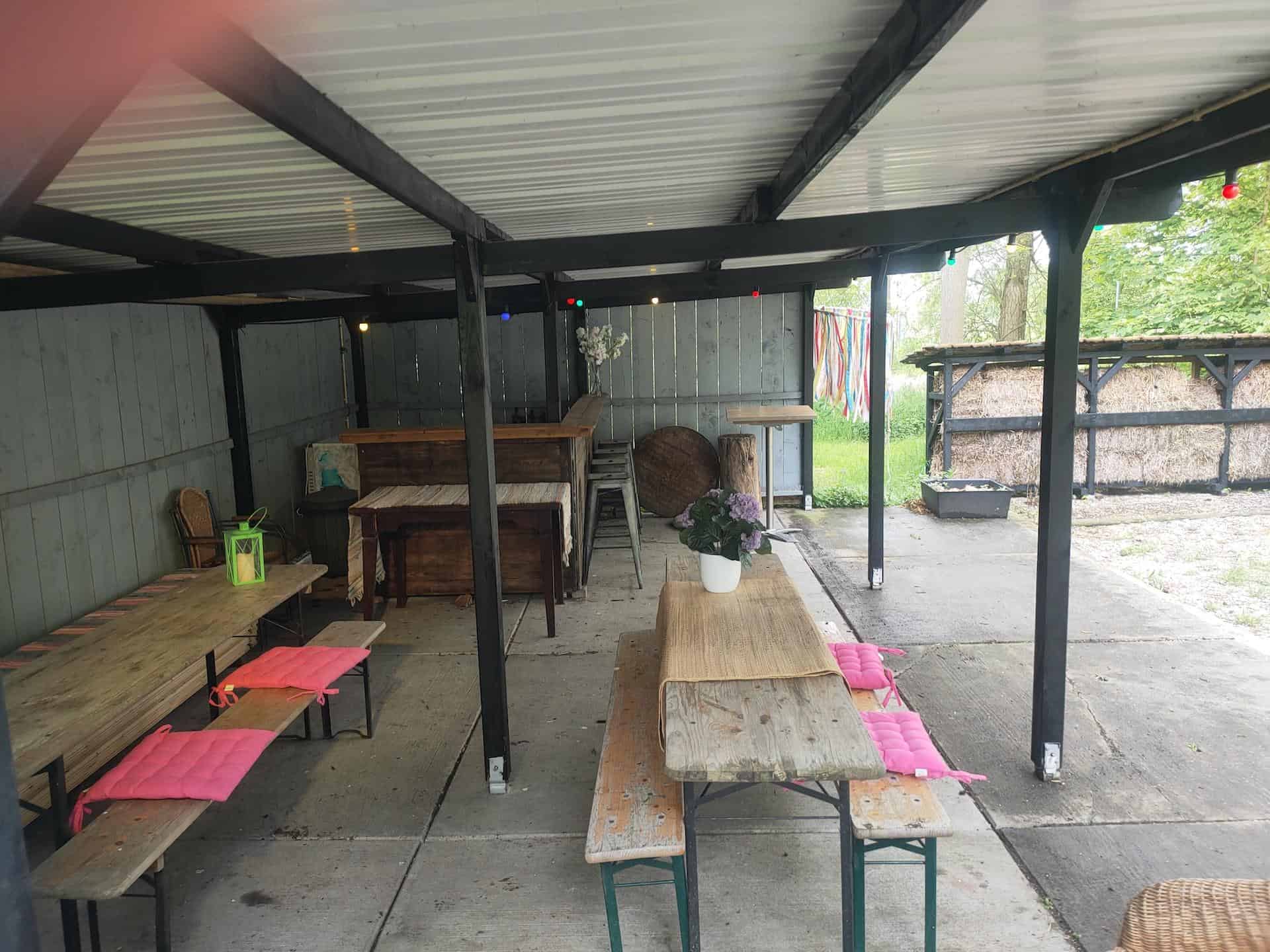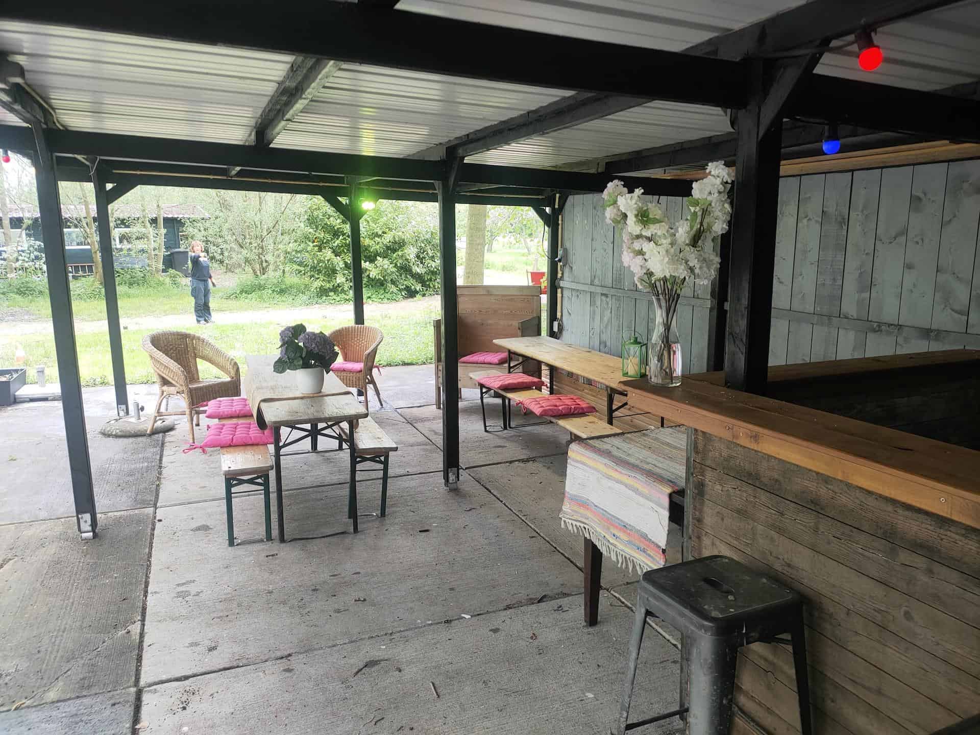 De veranda ligt midden in ons bos en is een overkapping van 10m x 15m met eigen bar en terras. De veranda is een leuke buitenlocatie voor groepen tot circa 25 personen. Het is een unieke plek voor een feestje of bijeenkomst in de buitenlucht. Valt er een spatje? Dan ga je lekker onder de overkapping zitten.