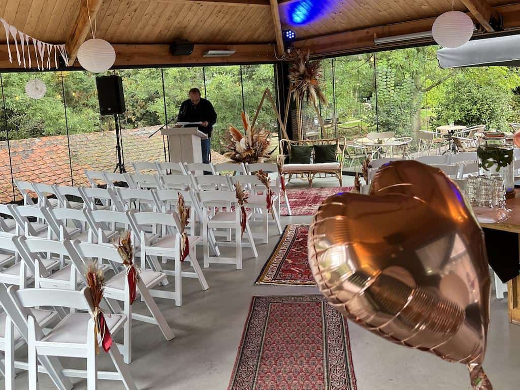 “Wij hebben een fantastische dag gehad, op een geweldige locatie. Het weer was wat twijfelachtig maar gelukkig konden wij in ieder geval tijdens de ceremonie buiten zijn. In het bijzonder willen wij onze complimenten uitspreken voor de gastvrouw!! Wat een GEWELDIGE vrouw!! Bedankt voor je gezellige bijdrage op onze dag!!
