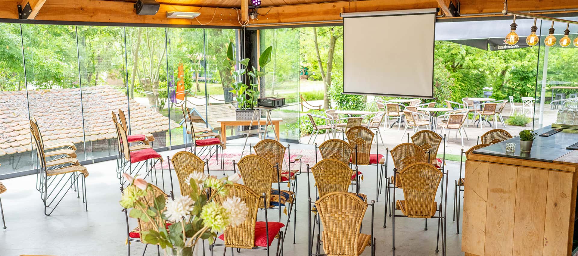 Een andere zeer geliefde (en tevens de grootste) binnenlocatie is De Stal. Dit is de plek waar vroeger de koeien stonden en is nu verbouwd tot een sfeervolle ruimte waar je onwijs veel kanten mee op kunt. De originele steunbalken en ramen in deze ruimte zijn uiteraard behouden, want die zorgen voor die toffe landelijke en authentieke uitstraling. Met de schitterende openslaande staldeuren en een eigen terras maak je in de zomer gemakkelijk het contact met buiten. De Stal is circa 300m2 en biedt plaats voor 20 tot 100 personen afhankelijk van de opstelling. De stal wordt tijdens events ook vaak gebruikt als algemene ruimte waar vergadergroepen de mogelijkheid hebben om in kleinere groepjes uit elkaar te gaan.